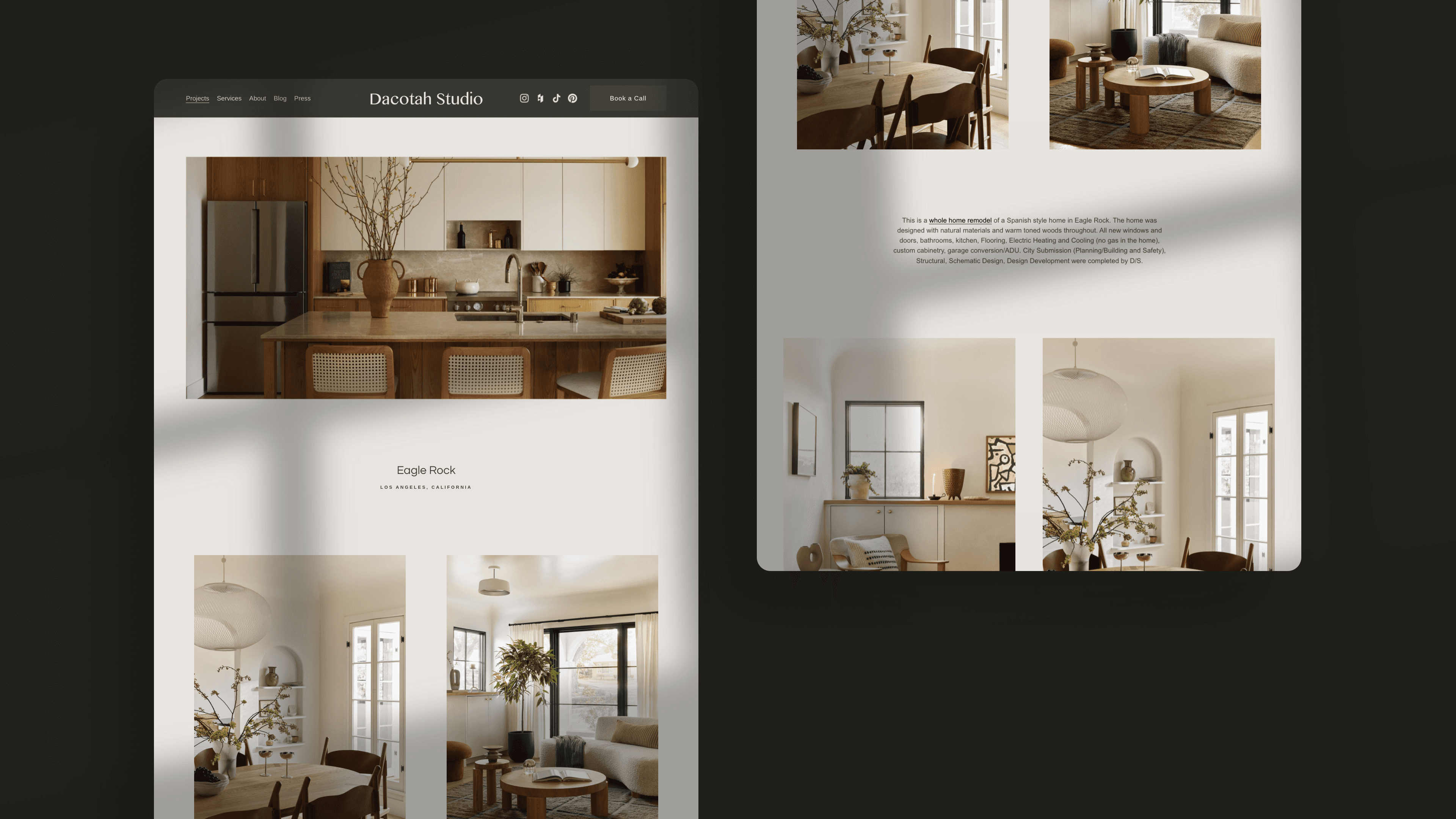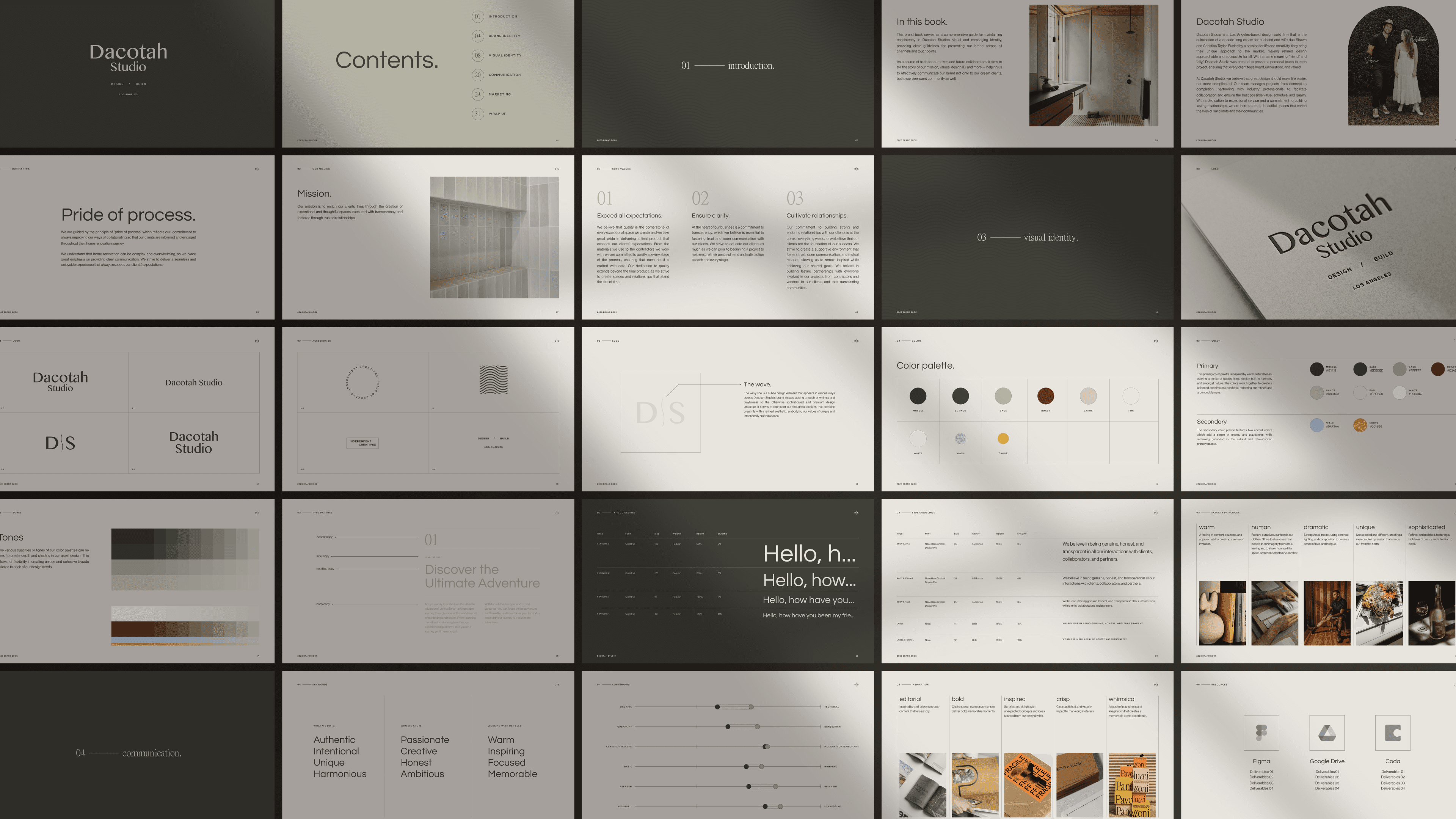 As a collaboration with the company’s founders, I helped shape Dacotah Studio’s brand identity, working closely to define and build a system rooted in craft and detail. Based in Los Angeles and Pasadena, the studio is a design/build firm crafting thoughtful, high-end residential living spaces. The work included a comprehensive identity and brand book that informed project proposal and social templates, site signage, and a new website, creating a clear, cohesive system with a warm, premium feel.